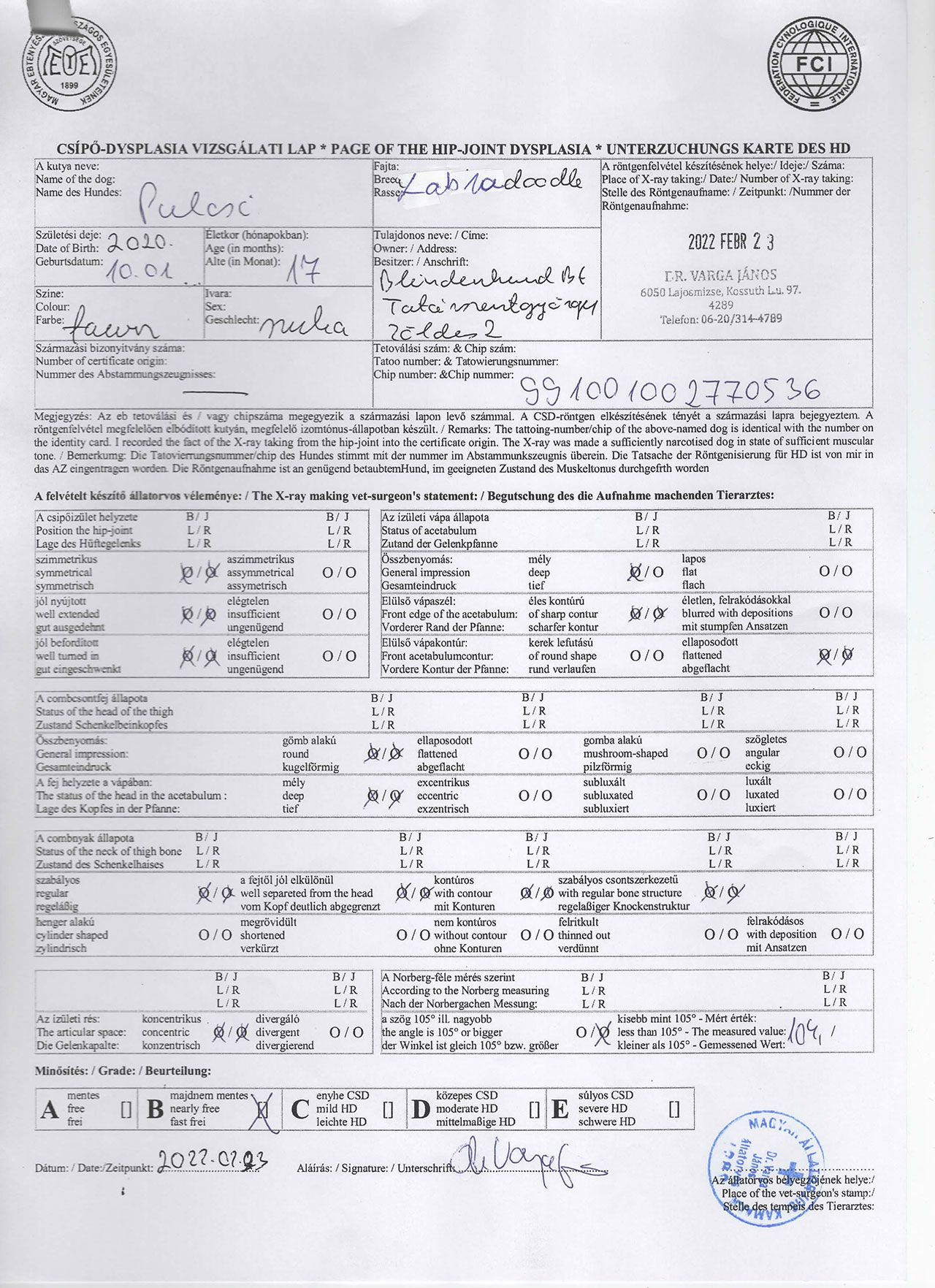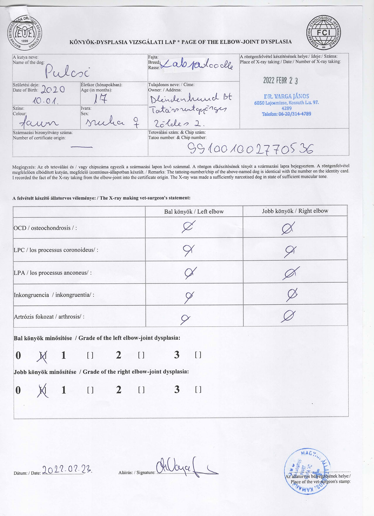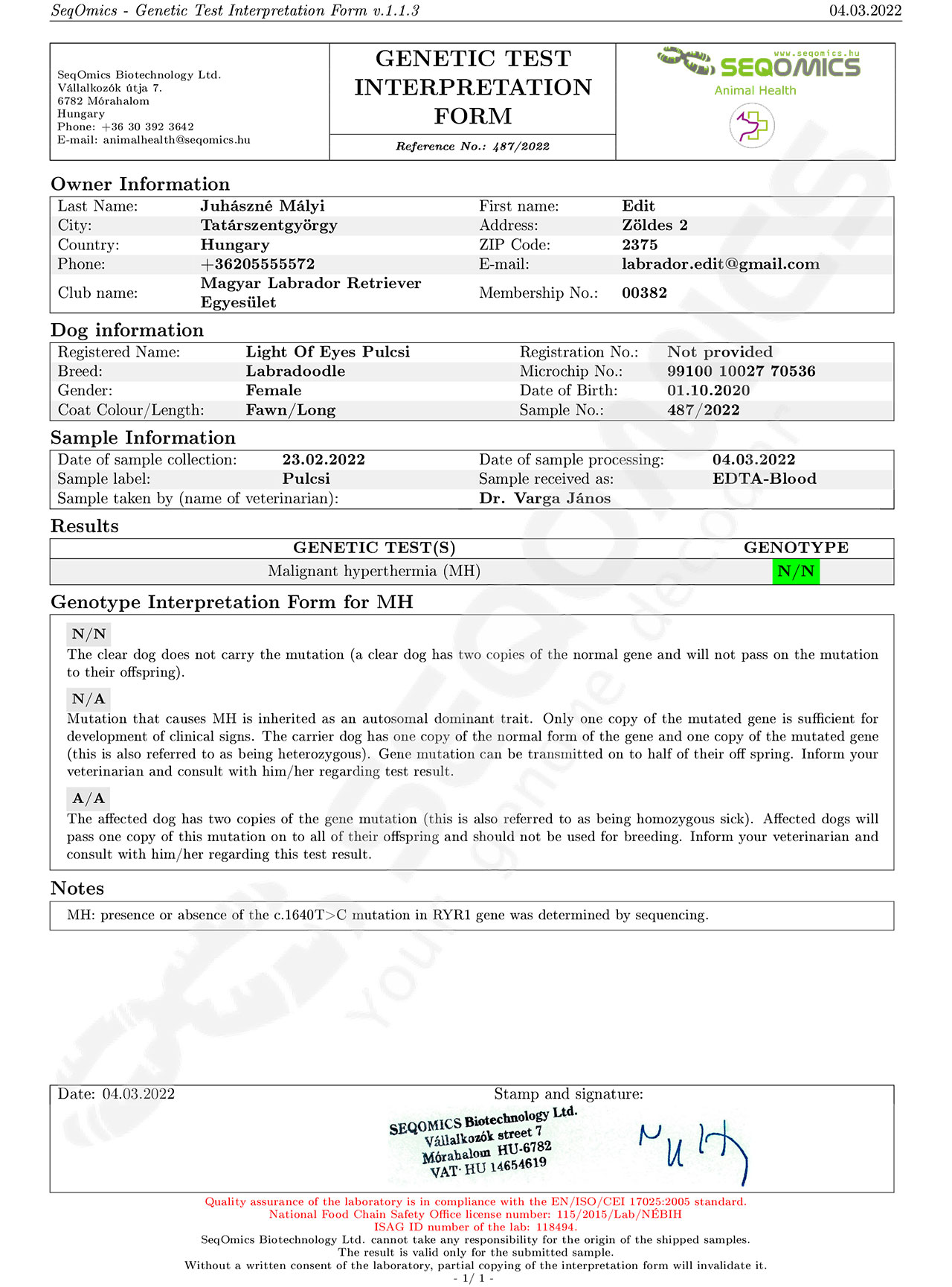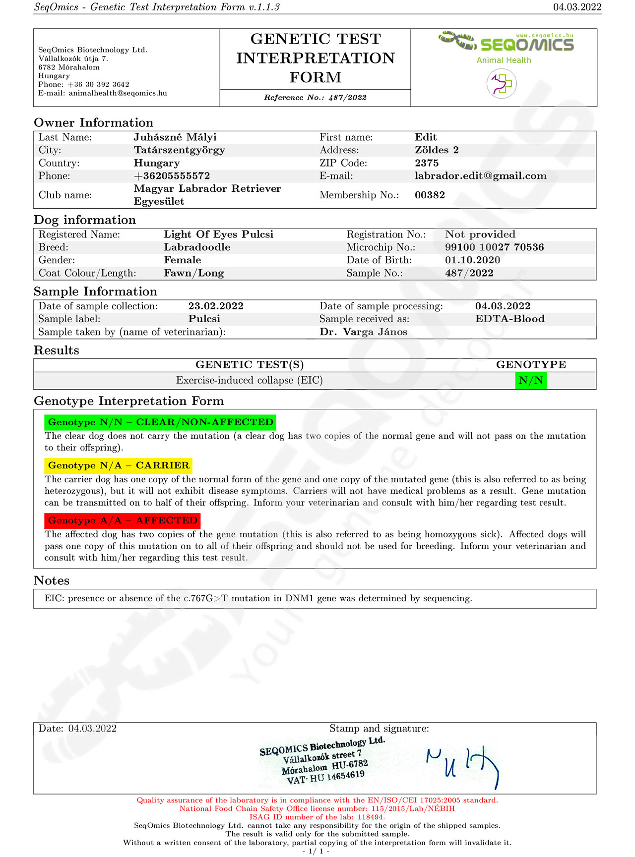 Zokni közepes F1 labradoodle Pulcsi testvére. Mamája Ballyhale Holly, labrador, papája Szása. Zokni nagyon okos, Pulcsi nagy „tanítója”, a csibészségeket is beleértve:). Szűrések: Könyökízületi diszplázia szűrés Csípőízületi diszplázia szűrés Malignant hyperthermia (MH) Progressive retinal atrophy (PRA-prcd) Degenerative myelopathy exon-2 (DM-exon2) Exercise-induced collapse (EIC) von Willebrand disease type I (vWD1) Share on ← → x ×